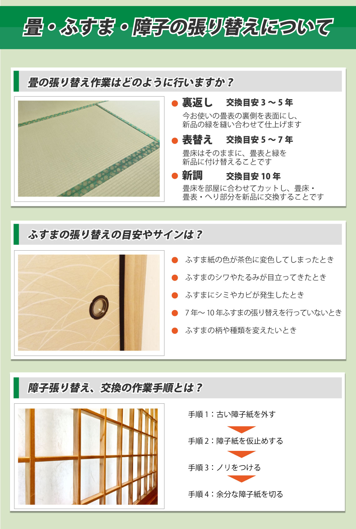 畳、襖、障子の張替えを考えた時、どういった業者に依頼すれば良いのでしょうか?どれくらいの料金がかかるのか、どういった対応を行うのかなど多くの心配がある方もみえるかと思います。そこで価格・対応・サービスなど業者を選ぶ際に知っておきたいポイントを押さえて、気持ちよく張替えを終わらせましょう。最初に気になるのは値段ではないでしょうか。出来うるものなら安価、低価格で依頼したいですよね。張替えの料金は、ある程度の相場は決まっていますが、一概に何円とはなかなか言えません。商品の品質や張替えの対応(畳であれば裏返し、表替え、新調など)で料金は変わってきます。そこで業者が商品や対応の説明をしっかり行い、最適な方法を提案してくれるかということを確認してみましょう。加えて、無料見積もりの利用をおすすめいたします。優良業者であれば、見積もりの詳細まで説明を行ってくれるので、追加料金の発生もありません。あわせて、業者の対応が親身であるかも見ておきましょう。こちらの相談や質問に対して、丁寧・的確・誠実に対応してもらえれば安心して張替えを検討できます。また、業者の技術・知識力も大切ですね。例えば、畳であれば『畳製作技能士』という資格もあるので問い合わせ時に作業員がそういった資格を持っているか確認しておきたいものです。他にもチェックしておきたいポイントがいくつかあります。商品の取り扱いが多い業者であれば、商品の価格や品質といった選択肢が増えて、商品選びがしやすくなります。また、小さなことですが、作業前の家具の移動、畳の拭き取りといったサービスを利用できると助かりますね。もし張替えでお悩みの際は、まずは気軽な問い合わせをおすすめいたします。安心できる業者であれば、小さな質問や相談からでも受け付けています。いきなりの問い合わせは不安という方は、業者によってはweb(LINE、メールなど)見積もり、相談も行っています。これらの知っておきたいポイントに気をつけつつ、満足のいく張替えにしたいですね。